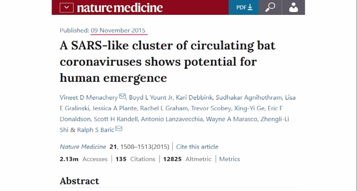 Так вот, в статье от 9 ноября 2015 года в одном из самых уважаемых медицинских изданий (Nature Medicine) группа не только американских ученых (из нескольких очень уважаемых учреждений, включая университет Северной Каролины Chapel Hill и Уханьский институт вирусологии) подробно описывает эксперименты с СОЗДАННЫМ ими ХИМЕРНЫМ вирусом.