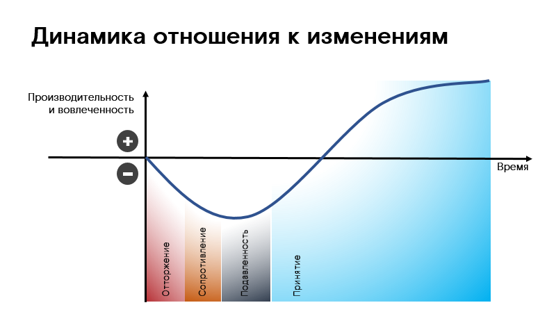 Реакция сотрудников на изменения При проведении изменений в компании руководители ежедневно сталкиваются с задачей реагирования сотрудников на изменения. Сотрудники отказываются прилагать дополнительные усилия, изучать новые требования к работе, они делают не то, что нужно (действуют по инерции, «по старинке») и высказывают недовольство ситуацией в компании. Происходит снижение производительности, компания теряет время и деньги. Поэтому руководителям важно понимать, с чем они имеют дело: что такое сопротивление и как им управлять. Итак, сопротивление изменениям – это снижение производительности или вовлеченности сотрудников в работу, обусловленное негативными ожиданиями (в том числе и воображаемыми). И происходит это не от злого умысла, а из-за психологических особенностей поведения человека, его реакции на изменения. Сопротивление рождает страх: страх потери и страх перед неизвестным и непонятным. Это может быть опасение потерять рабочее место, лишиться определенного статуса или прив