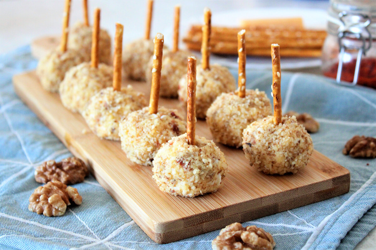 Закуска "Копченые шарики" из сыра и бекона в панировке из грецких орехов. Отличное украшение для праздничного стола и не только. Такая закуска однозначно исчезнет первой со стола благодаря своему эффектному виду и аппетитному аромату. Готовить ее не сложно, а продукты все доступные. Итак, для того, чтоб шарики приобрели копченый аромат нужно взять несколько полосок копченого бекона и обжарить их на сковороде до хруста, обязательно с двух сторон. Затем бекон нужно переложить на бумажное полотенце, чтобы он подсох. А пока занимаемся подготовкой остальных ингредиентов. Сыр и два яйца нужно натереть с помощью мелкой терки и переложить в салатник. Бекон отправляем в чашу блендера и измельчаем в мелкую крошку. Крошка будет не однородной, но так даже вкуснее. В салатнике смешиваем сыр, яйца, бекон, немного майонеза и молотую паприку. Соль я не добавляю потому как она есть и в сыре и в беконе и в майонезе, этого вполне достаточно. Майонез можно заменить