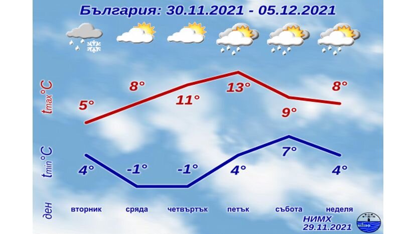 Сегодня будет облачно, на многих местах с дождем. После обеда в северо-западной половине страны ветер переориентируется на северо-западный и с ним начнет поступать холодный воздух. К вечеру дожди прекратятся, но ночью с запада вновь ожидаются осадки. Максимальная температура будет от 8-12° в Северо-западной Болгарии до 18-20° в Восточной Болгарии...На этой неделе максимальная температура в Болгарии повысится до 20°