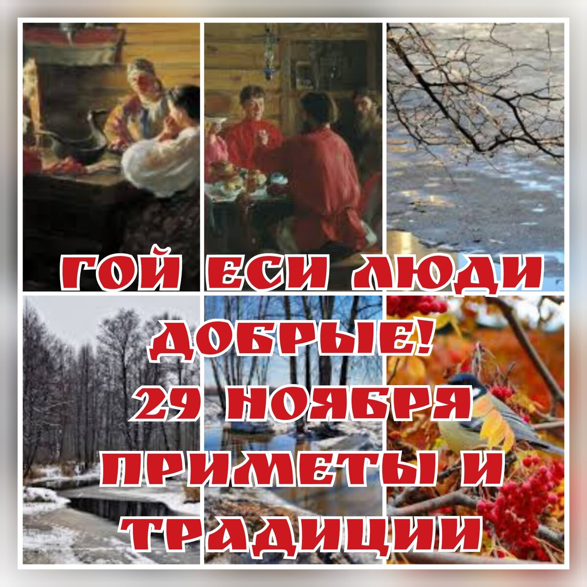 Гой еси, люди добрые! Во славу Пращуров Родных Богов! 29 ноября приметы и традиции Народное название месяца: Грудень, Полузимник, Бездорожник, Листогной Народное название дня: Ветродуй ( Зима отпотей ) По традиции в народе эту дату прозвали Ветродуй, так как обычно в этот день был сильный и холодный ветер. 29 ноября так же получил название «Зима отпотей», так как 29 ноября часто наблюдались оттепели. А вот если в этот день дули буйные ветры, то вьюги и метели должны были продолжаться до Велеса Зимнего 19 декабря. 29 ноября тяжелым трудом не занимались, поэтому проводили время дома в ожидании гостей. Если приходил нежеланный человек, его принимали, угощали, однако после ухода мыли пол и входные двери заговореной водой. Когда же задерживался дорогой гость, то втыкали в ручку веника булавку, и ставили его у входной двери. 29 ноября старались не надевать на себя красное, – по приметам считалось, что так можно накликать на себя беду. По той же причине не смотрелись 29 ноября в