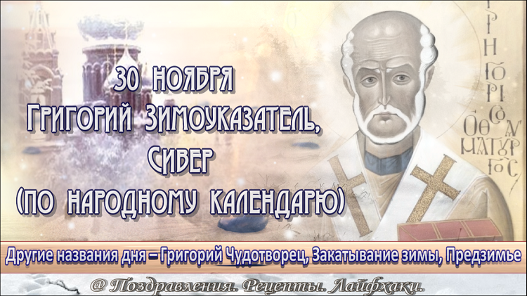 Доброго денечка! Согласно народному календарю день называется – Григорий Зимоуказатель, Сивер. Верующие вспоминают Григория Чудотворца – святителя, проповедника, богослова и епископа Неокесарийского (III век). Своими проповедями он исцелял людей и учил, как найти правильный путь в жизни. Если верить народным приметам 30 ноября следует ждать обильного снега. Обычно на Руси в этот день устраивали катания на санях. И по погоде данного дня определяли, какую погоду ждать зимой. Чтобы быть здоровым в этот день валялись в снегу и обтирались снегом. В этот день нельзя примерять чужие кольца, тем более обручальные – к несчастью. Стричь сегодня волосы – судьбу укорачивать. Сон на 30 ноября считается вещим. Говорили, что он быстро сбудется, если его запомнить в деталях. Если девушке приснилось дерево с плодами – к скорому замужеству, а замужней женщине – к счастливой семейной жизни. А вот если сухое дерево приснилось – к болезни. Женщины в этот день вязали, т.к. верили, что вещи связанные сегодн