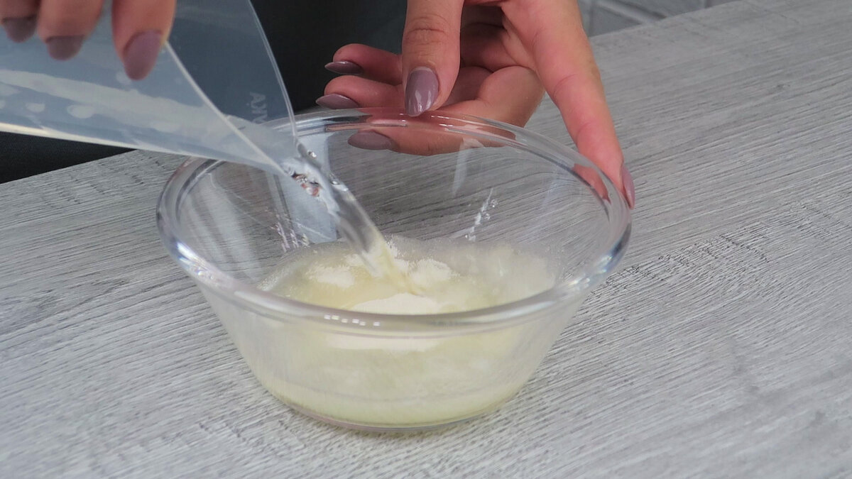 Нам понадобится 20 г. желатина. Заливаем водой 80 мл. Перемешаем и оставляем на 10 мин набухать.