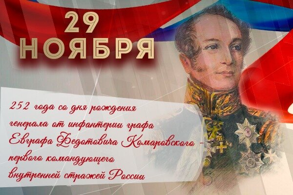29 ноября 2021 года (по новому стилю) исполняется 252 года со дня рождения генерала от инфантерии Евграфа Федотовича Комаровского. Для большинства исследователей отечественной истории XVIII-XIX веков Е.Ф. Комаровский известен как автор многократно переизданных в России в разные времена «Записок графа Е.Ф. Комаровского» – мемуаров литературно одарённого и по-военному наблюдательного императорского генерал-адъютанта. Участник Итальянского и Швейцарского походов русской армии под командованием А.В. Суворова и Отечественной войны 1812 года, Комаровский по воле судьбы оказался очевидцем ключевых событий чрезвычайно важной для становления и укрепления российской государственности эпохи от Екатерины II до Николая I.