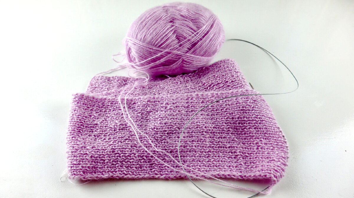 - Важно достаточно хорошо растягивать шарф, чтобы получившаяся шапка удобно «сидела» на голове. Лучше сделать несколько примерок, тогда будет понятно, когда надо закончить вязать шарф в длину.