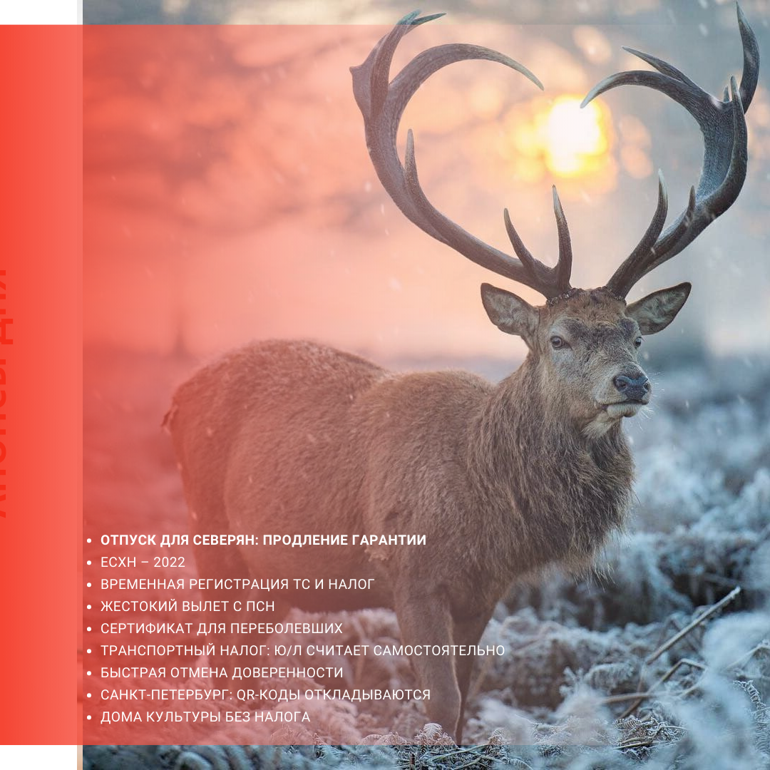 1. Отпуск для северян: продление гарантии Продлен особый порядок компенсации проездных расходов северянам, отправляющимся в отпуск. Напомним: особый порядок оплаты работодателем стоимости проезда и провоза багажа для работников-"северян" и членов их семей установлен еще в прошлом году из-за действия ограничительных мер, связанных с коронавирусом. Согласно им, если гражданин не воспользовался правом на такую гарантию в 2020 году, то он может сделать это в 2021 году. Теперь правительство решило продлить период реализации права и на 2022 год. Постановление Правительства РФ № 2004 от 22 ноября 2021 г. 2. ЕСХН – 2022 Продолжаем знакомить вас с изменениями законодательства 2022 года (в части принятых поправок). Так, в отношении ЕСХН необходимо учесть, что на следующий год действует сниженный лимит доходов от реализации, при соблюдении которого плательщик вправе воспользоваться или сохранить освобождение от уплаты НДС. Кроме того, в следующем году пользователям этого спецрежима стоит обратить