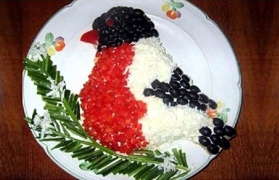 Поместите на плоскую тарелку рис так, чтобы получились очертания снегиря, и смажьте майонезом. Дальше выложите курицу, лук, желтки и белки. После каждого слоя, кроме белкового, смазывайте соусом. Из помидоров выложите грудку и клюв снегиря, из маслин — голову, крылья и хвост. Из лука сделайте веточки.