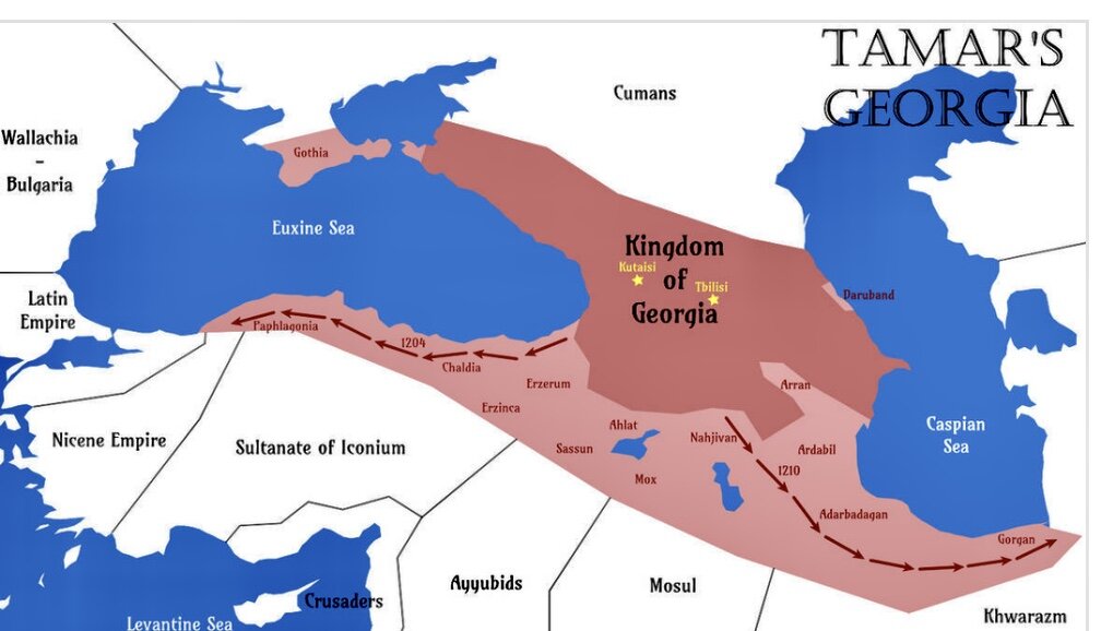 То, что Сочи с пригородами был грузинским, в Грузии знают все, очень этим гордятся и любят в разговорах упоминать. Историю этого я здесь уже описывал. А вот про принадлежность Грузии Крыма услышал впервые. Об этом мне поведал грузинский учитель истории, с которым мы разговорились на набережной Кобулети. Он патетично вспоминал Давида Строителя, царицу Тамару, великую Грузию и то, что в эти славные для страны времена весь Кавказ, половина нынешней Турции, Армения с частью Айзербайджана и весь восточный берег чёрного моря были грузинскими. Я вежливо удивлялся, а потом начал разбираться. Какая-то доля правды в этом есть. Но не весь Крым, очень не долго, очень давно и формально это все в состав Грузии не входило. Дело было в 13-м веке, когда царица Тамара приютила потомков византийского императора после взятия Константинополя крестоносцами. Алексей и Давид, из семейства византийских Комнинов, как их звали, были ее роднёй, племянниками, воспитывались при ее дворе, а потом попросили у