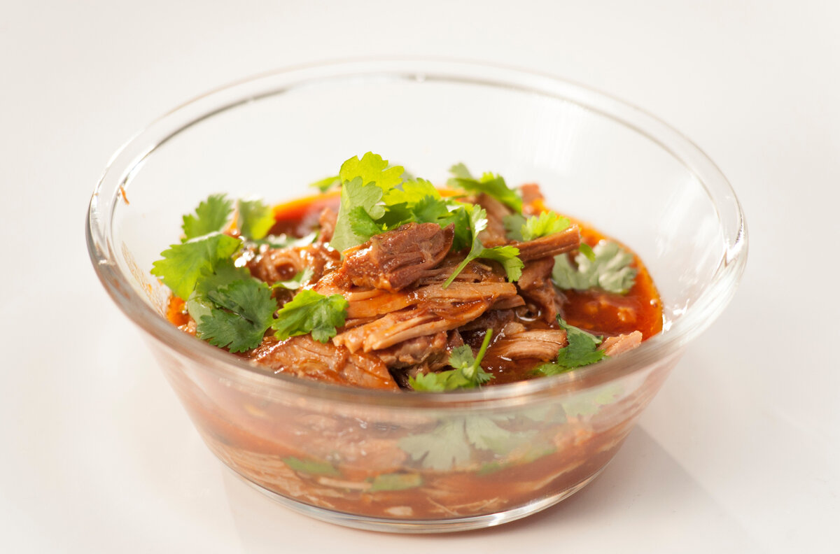 6. По готовности вынимаем из казана всё мясо, разделяем на волокна. Вливаем остатки маринада в казан и доводим его до кипения. Выкладываем мясо в глубокую миску, заливаем соусом и украшаем свежей кинзой. Приятного аппетита!