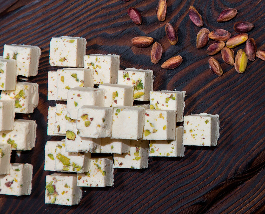 - Посыпьте сверху мелко порубленными орехами, и вдавите их в халву.