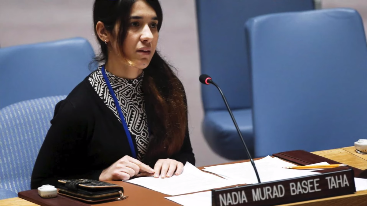 Надя Мурад - езидская правозащитница. Джихадисты ИГИЛ (запрещена на территории РФ) взяли её в плен после того, как убили сотни людей в её деревне, включая 6-рых её братьев и сводных братьев. Её избивали, пытали и насиловали как рабыню ИГИЛ (запрещена на территории РФ).