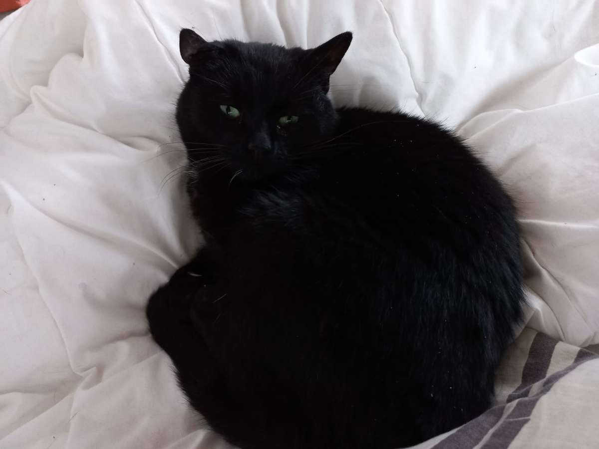 Этот кот на себя внимание обратил сразу: крупный, с красивой шубкой угольно-черного цвета и невозможно печальными глазами. Он не бежал к кормушке, как остальные бездомыши, а подходил к ногам и ждал, пока погладят. Если ему удавалось залезть «на ручки» – начинал петь.