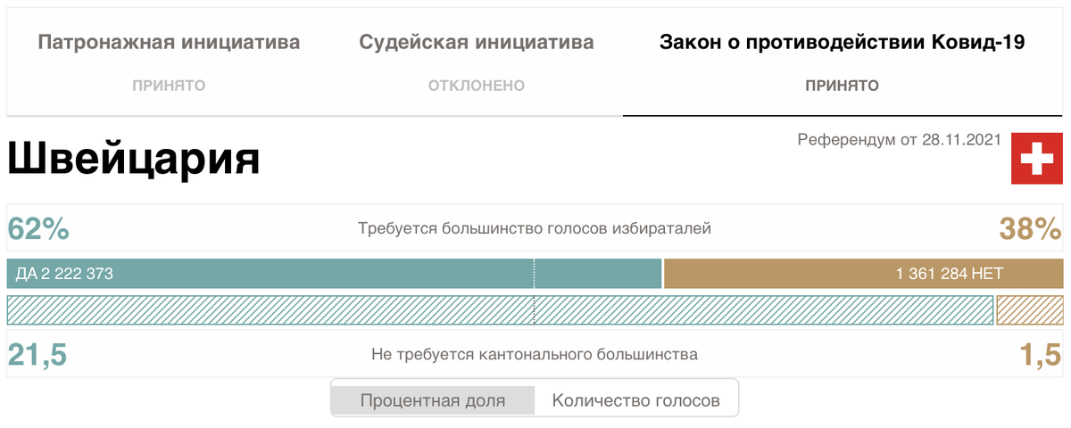 Как сообщил сайт swissinfo.ch, 28 ноября в Швейцарии прошел референдум, на котором решалась судьба так называемого «ковидного законодательства». В этот раз 62% избирателей выступили против попытки отменить Федеральный закон о правовых мерах противодействия пандемии, также часто называемый просто «ковидным законом». Он позволяет правительству вводить такие меры, как так называемый «ковидный сертификат» – документ с QR-кодом, действующий в стране с сентября 2021 года – для контроля распространения вируса. Это уже второй раз за текущий год, когда швейцарцы получили возможность напрямую высказаться по поводу мер реагирования на кризис: в июне 60% поддержали первоначальный текст закона о противодействии коронавирусу. QR-сертификат является доказательством вакцинации, отрицательного теста или иммунитета от заражения вирусом. Он позволяет посещать общественные места, культурные учреждения, бары и рестораны. У него нашлось достаточно активных противников: они заявляли, что эта мера