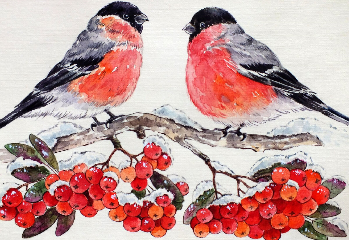 Снегирей часто можно увидеть на ветвях рябины, ягоды которой вызревают глубокой осенью и птицы прилетают ими полакомиться. Образы снегирей и рябины часто соседствуют в искусстве, на картинах художников, праздничных зимних открытках и т.д. Эту ассоциацию использовал в первых строках своей известной песни поэт, композитор и певец Сергей Трофимов, сочетающий в своём творчестве элементы традиционной эстрады, шансона и авторской песни.