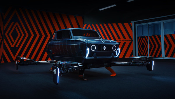 Вместо колёс— алюминиевые опоры. Кузов, внешне напоминающий юбиляра, целиком выполнен из углеродного волокна, как и лопасти четырёх пропеллеров. При проектировании и виртуальных тестах, принёсших «терабайты данных», будто бы использовался искусственный интеллект. К 60-летию «культовой» модели Renault 4 уже созданы концепты e-Plein Air и Suite N°4, но стартап TheArsenale по заказу реношников построил во Франции ещё одну необычную интерпретацию «иконы автомобильной культуры». По идее, квадрокоптер Air4 взлетает со скоростью 4 м/с на высоты до 700 м, развивает в воздухе 85–90 км/ч, наклоняясь на 45–70°, и садится в темпе 3 м/с. Электромоторы питаются от литиево-полимерных батарей суммарной ёмкостью в 90 000 мА•ч. Тяга с векторизацией оценена в эквивалент 380 кг (по 95 на каждый двухлопастный пропеллер). Новый хэтчбек Renault 4 на электротяге ожидается до 2025-го. Видео подтверждает, что Air4 действительно летает (до 15 м), пусть и без людей на борту. Проект реализован менее чем за шест