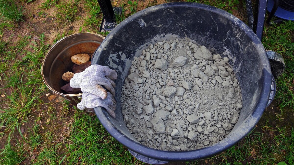 Закупать цемент впрок — неправильно. Но я такую ошибку совершил и вышло так, что три купленных еще в прошлом году мешка цемента пришли в негодность, т.к. слежались и затвердели комками. При этом хранились мешки в сухом месте, где не было ни капли воды. Но, так или иначе, влага заставила цемент испортиться. Тыщу рублей на выброс? Раз цемент скомковался, то можно его раздробить. Попробовал поленом в железном ведре — больно утомительно. Посадить это делать бабушку — полено жалко, пригодится еще в печку (шутка)… Тогда заставим работать бетономешалку. Пусть она немножко побудет цементодробилкой (грохот). В качестве дробящего элемента придумал использовать обычные камни. Посчитал, что для моих объемов достаточно будет полуведра небольших, но увесистых камней. Их и засыпал вместе с цементом в бетономешалку. А вот теперь самое интересное — дозировка! Да, не удивляйтесь — дозировка здесь оказалась очень важна. На первый раз я, посчитав что кашу маслом не испортишь, накидал довольно много це
