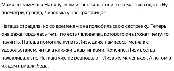 Девочка росла избалованной, ведь родители всю душу вкладывали в неё; так и росла Наташа. Всё шло хорошо, пока девочка не получила «подарок». Дело в том, что родилась её младшая сестра. Звали её Лизой. Всё внимание родителей было адресовано новой дочери. Наташа не могла терпеть всё это, поэтому в её сердце закрылась нехорошая идея, которая не отпускала мысли девочки.