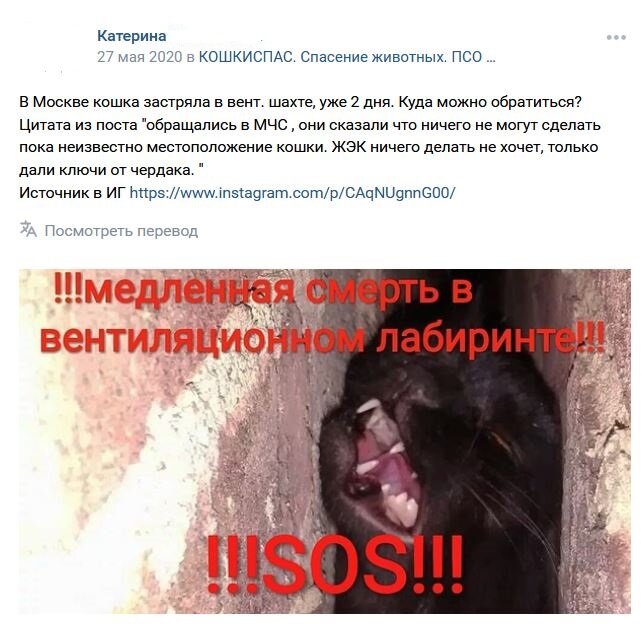 Дело было в конце мая, когда к нам в группу написала женщина из Москвы (напомним, что мы в Санкт-Петербурге), у которой недавно взятая из приюта в дом кошка прямо при ней исчезла в вентиляции. Кошки нет, где она и что делать непонятно. Переживания и расстройство. Так видимо сложились звезды и планеты, а может шило вылезло не вовремя, но мы втроем решили на следующий же день мотануться в Москву и выяснить на месте, что там происходит.