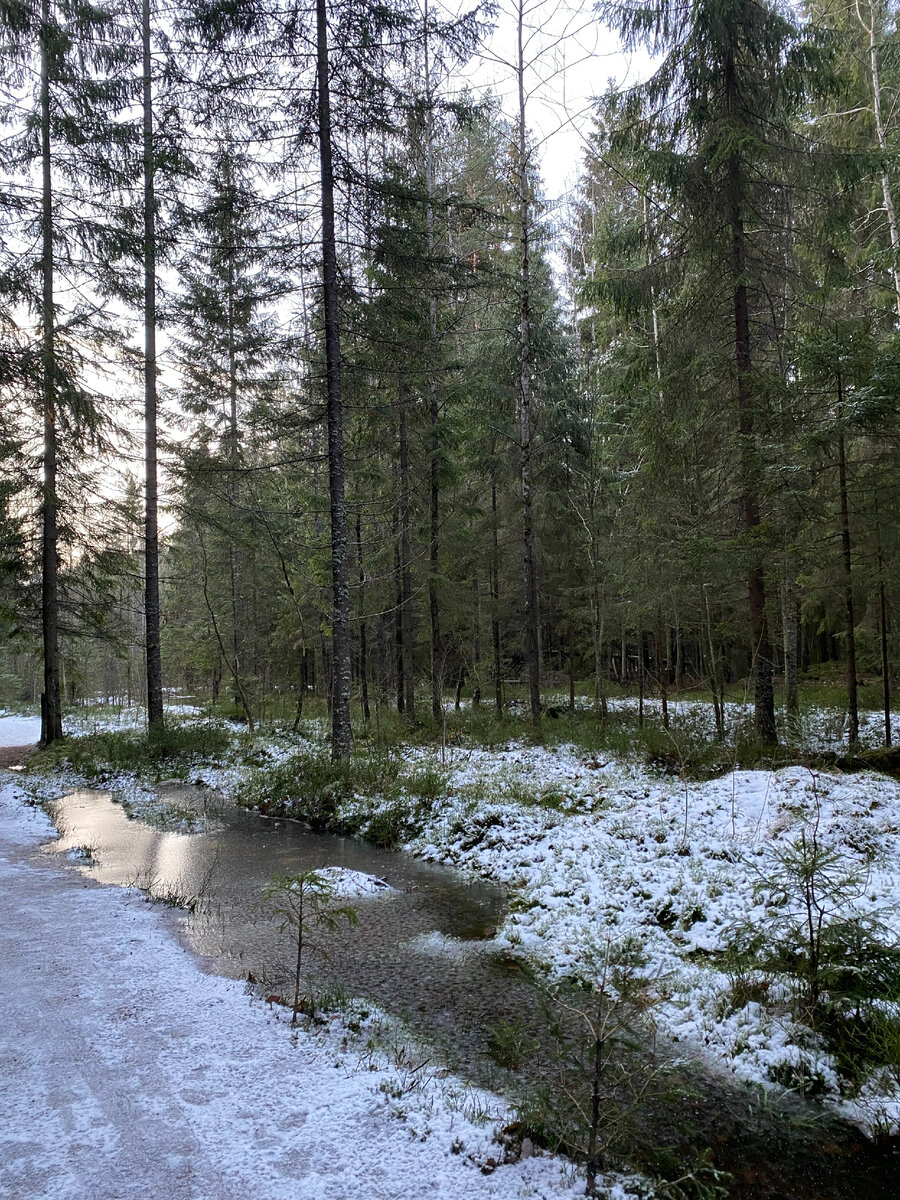 Удобно ехать от станции «Девяткино» в Приозерском направлении. Вышел из метро и тут же оказался на платформе. Всего 23 минуты в пути и мы на железнодорожной станции «Осельки». Начался наш поход "Осельки - Токсово". Немного пройдя через посёлок мы свернули в лесной массив. Здесь лес в основном хвойный, еловый. Погодные условия располагали к пешей прогулке: чуть подморозило, выпал первый снежок, день был пасмурный с проглядывающим сквозь облака солнцем. А на хвоинках красота – следы ледяного дождя. Мы шли по проторенным дорожкам, а под ногами поскрипывал снег. Такой приятный хруст сопровождал нас весь путь. По сторонам радовали глаз запорошенные снегом ёлочки. На лужах образовался лёд, и мы смеясь, как дети его кололи. Мы находились в природном парке Токсовский. Встретили несколько домиков – кормушек для пернатых, заполненных семечками. Пожалели, что сами не сообразили взять с собой угощение для них. Останавливались около, с интересом наблюдали за птицами. Были птички посмелее, в основн