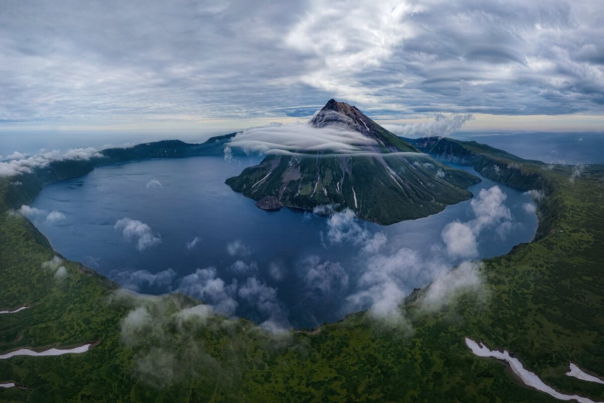 В южной части этого длинного узкого острова находится озеро Кольцевое. В центре озера-кальдеры почти на полтора километра вознесся конус молодого вулкана, Верхушка черной горы припудрена снегом и чуть-чуть дымится, напоминая о своем происхождении. А на побережье острова Харимкотан после очередного извержения вулкана Севергина образовалось множество мелких озер, питаемых ручьями, стекающими с его склонов. Вода ручьев насыщена минеральными солями, и на дне озер эти соли отлагаются концентрическими кругами, образуя разноцветные осадки: красные, оранжевые, желтые, зеленые, белые. В каждом озере своя, особенная окраска дна, и в солнечных лучах россыпь водяных блюдец отливает всеми цветами радуги. Необычно строение вулкана Заварицкого на Симушире. Здесь со дна древней кальдеры, как и на вулкане Креницына, вырос новый конус. Но и он, в свою очередь, взорвался, образовав "кальдеру в кальдере". Середина ее занята озером Бирюзовым. Это, наверное, самое красивое озеро на архипелаге: в хорошую п