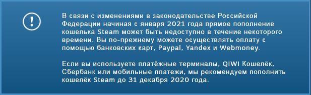 С 1 января 2021 года в steam исчезла возможность прямого пополнения аккаунта, о чём сам стим предупредил во время зимней распродажи, написав, что с помощью Qiwi, яндекс денег, баланса телефона, сбербанк онлайн пополнение будет не доступно. Связано это с законами запрещающим денежные переводы заграницу в обезличенной форме (компаниям, обычным гражданам и тд), то есть когда не известен фактический получатель денежных средств. Законы направлены на борьбу с финансированием терроризма, а итоге, собственно как и всегда, страдают рядовые граждане: мало того, что каждое пополнение требует ввода данных банковской карты (если, конечно, вы не поставили галочку «запомнить»), так и еще за каждую покупку таким образом вы платите комиссию (в зависимости от банка). Обладатели карты «Мир» вообще не в почёте — им, прежде чем что-то оплатить, придётся перевести деньги на Qiwi или ЮMoney (яндекс деньги), создав там виртуальную карту Visa. Все скажут, что всем это понятно и уже все пополняют аккаунт с банк