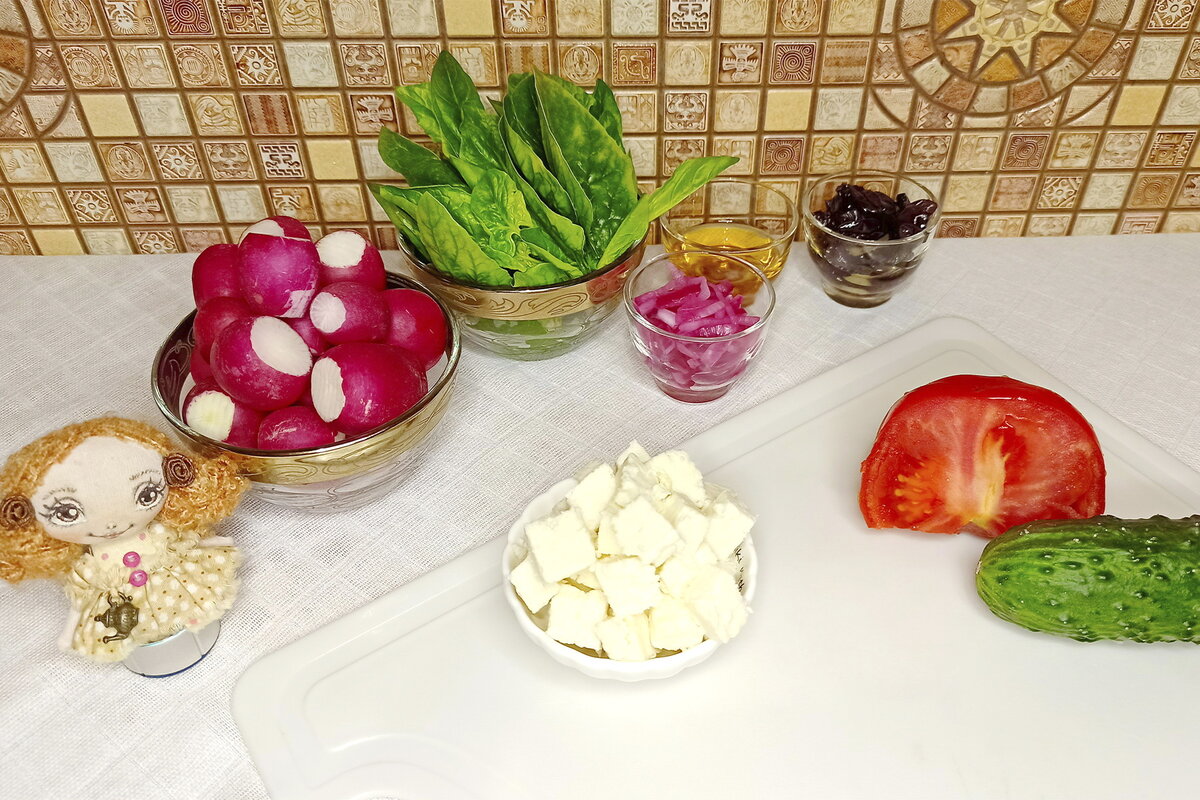 Люблю шпинат во всех его проявлениях: могу есть и на первое, и на второе, и даже на десерт. Ниже рецепт любимого салата с его участием. Список ингредиентов и их количество в конце статьи. ПРИГОТОВЛЕНИЕ Первым делом замаринуем лук. Лучше всего для этого салата подойдёт фиолетовый. Нарезаем его полукольцами и маринуем в уксусе, разбавленном с водой 1:1 (сахар и соль по вкусу). В течение 15 минут лук будет готов. Моем овощи и шпинат. Лучше покупать молодые листья шпината, и я предпочитаю для салатов обрезать жёсткие стебельки, используя только листья. Также часто он продаётся не слишком чистым, грязь забивается в бороздки, поэтому вымывать стоит тщательно. Редис нарезаем тонкими пластинками, помидор и огурец кубиками среднего размера. Всё кроме сыра и слив перекладываем в салатник, добавляем масло, соль по вкусу и перемешиваем. Сыр и сливы выкладываем сверху. Но это больше эстетический момент для красивой подачи, можно не заморачиваться и просто смешать сразу все ингредиенты. Салат готов