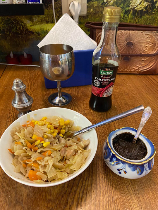 На дно кастрюли укладываются свиные хрящики. Нет их - любое мясо режьте, на ваш вкус. Луковицу порезать, и туда же. Потом капусту свежую так же режете и вторым слоем укладываете. Морковку я добавляю всегда. Можно добавить ложку-другую кукурузы. Специи - по вкусу. А сверху надо выложить слой квашеной капусты и закрыть крышкой. Тушить 1,5-2 часа. Сок квашеной капусты должен пропитать все слои. Мясо (хрящики) распариваются до очень мягкого состояния. Пропорции мяса и капусты (той и другой) - примерно 1/1/1. И грибной соус. Готовится из сушеных грибов, перемолотых в порошок. Основа абсолютно любая. Хоть сметана, хоть сливки, хоть майонез. У меня на сметане с добавкой соевого соуса. Порошок грибной со сметаной замешала, соевого соуса немножко налила, и в микроволновке нагрела. Всего делов-то. Но очень вкусно :) Больше общения и рецептов - в группе "Жизнь с диабетом"
