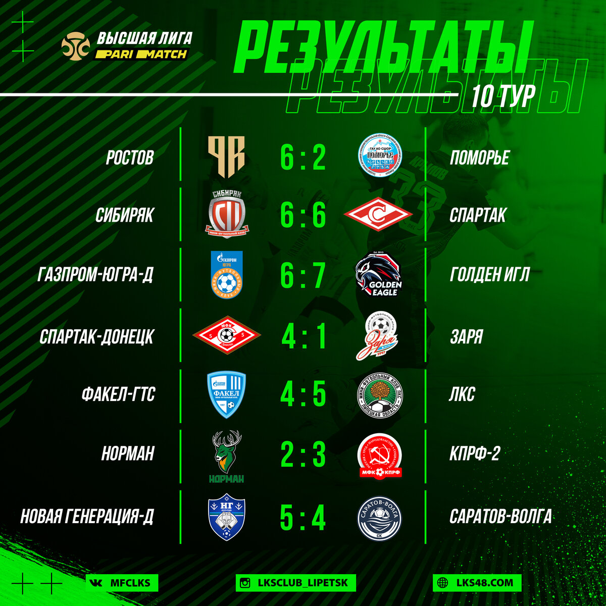 Результаты и обзоры матчей 10-го тура Париматч - Высшей лиги Первенства России по мини-футболу среди мужских команд, конференция «Запад», сезон 2021/22 гг. Результаты матчей 10-го тура: Обзоры матчей 10-го тура: МФК "Ростов" (Ростов-на-Дону) - МФК "Поморье" (Архангельская область) - 6:2. ПМФК "Сибиряк" (Новосибирск) - МФК "Спартак" (Москва) - 6:6. МФК "Газпром-Югра-д" (Югорск) - МФК "Голден Игл" (Ставрополь) - 6:7. МФК "Спартак-Донецк" (Ростовская область) - МФК "Заря" (Якутск) - 4:1. МФК "Факел-ГТС" (Сургут) - МФК ЛКС (Липецкая область) - 4:5. МФК "Норман" (Нижегородская область) - СК КПРФ-2 (Москва) - 2:3. ФК "Новая генерация-д" (Сыктывкар) - СК "Саратов-Волга" (Саратов) - 5:4. Турнирная таблица после 10-го тура: Ближайший матч МФК ЛКС проведёт в Липецке 4-го декабря. На паркете спорткомплекса ЛГТУ липчане примут лидера турнира - ростовский "Спартак-Донецк".