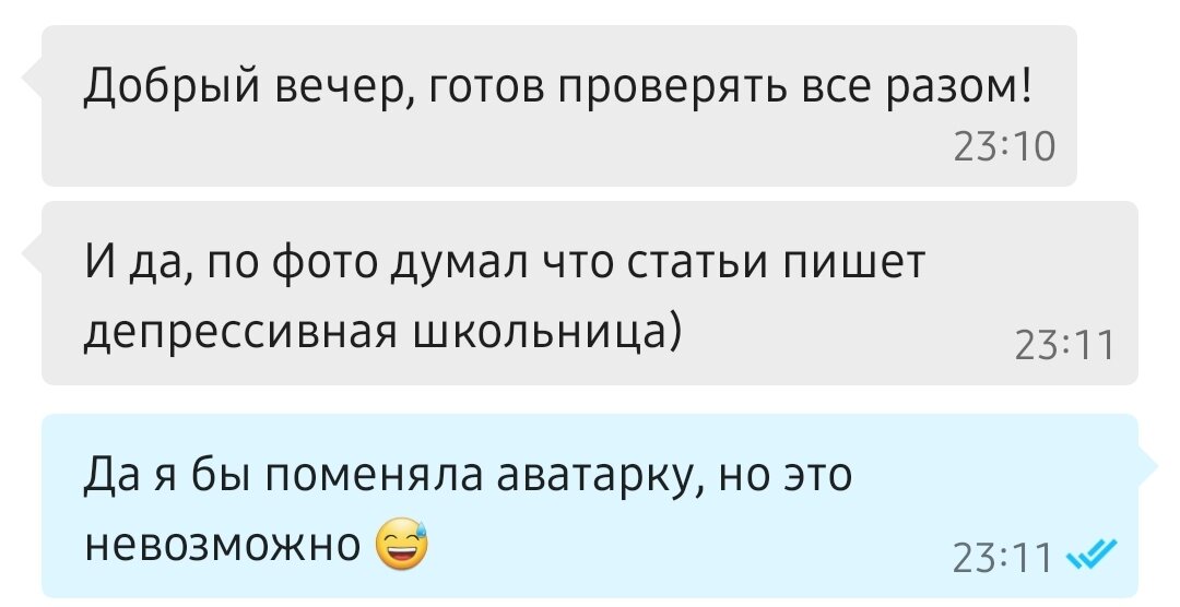 И вот действительно налицо тот факт, что заказчики не любят связываться с подростками. Мой теперь уже постоянный клиент написал те самые слова из первого скриншота в статье: "Я думал статьи пишет депрессивная школьница". Вот блин!))