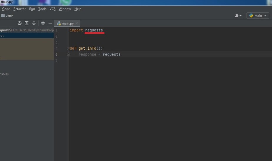 Иногда с модулем requests в PyCharm возникают проблемы. После того, как вы его устанавливаете через терминал, и он успешно устанавливается, PyCharm как будто бы его не видит. И когда вы начинаете писать код, импортируете этот модуль, requests подчёркнут красной волнистой чертой, а справа в углу горит предупреждающий красный значок. Признаюсь честно!))) Я по незнанке подумал что я что-то намудрил с настройками PyCharm, потому что в IDLE requests отлично работал, и даже попробовал переустановить PyCharm. Как вы уже наверное догадались, положительного результата я не добился!))))) А решается эта проблема просто и в течении минуты! Сейчас я вам наглядно покажу как. В правом верхнем углу вы нажимаете на Настройки (шестерёнку) и следом на Settings. Дальше выбираете Python Intepreter и нажимаете "+". В появившемся окне в графе поиска пишите requests и нажимаете Enter. И следом нажимаете на кнопку Install Package! Снизу должна появиться вот такая вот надпись в зелёной полоске. Это зн