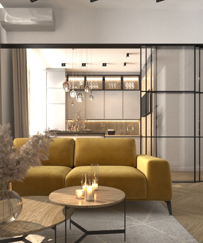 В результате мы получаем светлое пространство в котором применены теплые текстуры и светлые оттенки, а в качестве главного акцента в помещении служит диван горчичного цвета и реечная стена с крупной ботаникой, за счет чего создается теплая атмосфера в интерьере, при этом в рамках бюджета на которые рассчитывал заказчик.