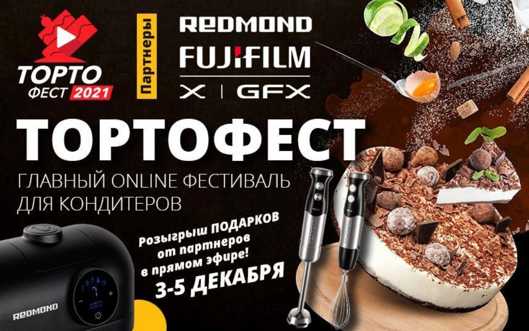 “ТОРТОФЕСТ-2021” приглашает любителей и опытных кондитеров. Главный кондитерский онлайн фестиваль снова собирает друзей. Он пройдет с 3 по 5 декабря и будет одинаково интересен и полезен любителям и профессионалам. Зарегистрироваться как участник вы можете по ссылке: https://tortofest.ru. Организаторы ждут: На фестивале “ТОРТОФЕСТ” своим профессионализмом и фирменными секретами поделятся мастера кондитерского искусства. За три дня участники: Ну и, конечно же, три фестивальных дня зарядят энергией и мотивируют к новым свершениям, потому что "ТОРТОФЕСТ 2021” - это практика и еще раз практика, интересная программа и дружеская атмосфера. На фестивале будут проведены розыгрыши с ценными призами от партнера фестиваля REDMOND, международного бренда малой бытовой техники, которые обязательно пригодятся кондитеру на кухне. Участники ТОРТОФЕСТа могут стать обладателями приборов от REDMOND: кухонная машина, три модели блендера, миксер и кухонные весы. Специалисты Fujifilm подготовили крутой инфор