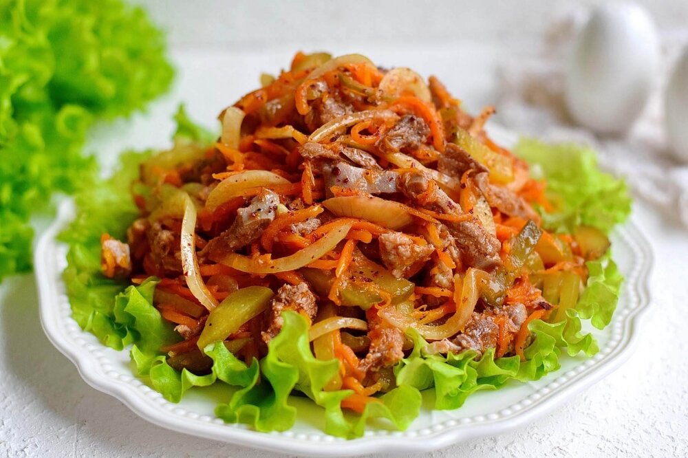Рецепт вкусного мясного салата. Готовится салат быстро, получается очень сытным и питательным. Достаточно дополнить его гарниром, и на столе у вас будет полноценный обед. Нежное мясо телятины дополняем овощами в разных вариациях — пассерованную морковь, маринованный лук и соленые огурцы. Для заправки используем острый перец чили, который придает салату выраженные жгучие нотки. Острый кетчуп при желании можно заменить на обычный. Ингредиенты: Маринад для лука: Приготовление: Головку репчатого лука очистите, нарежьте полукольцами, поместите в пиалочку, залейте водой, уксусом, всыпьте сахар и щепотку соли, перемешайте. Лук маринуйте 10-15 минут. Он получится кисло-сладким и хрустящим. С моркови снимите верхний слой, ополосните, натрите на терке со специальной насадкой «морковь по-корейски». Полоски моркови легка обжарьте в масле. Приправьте овощ молотым перцем, солью, добавьте измельченный чеснок, перемешайте. Морковь должна напитаться маслом, при этом остаться хрустящей. Телятину заранее