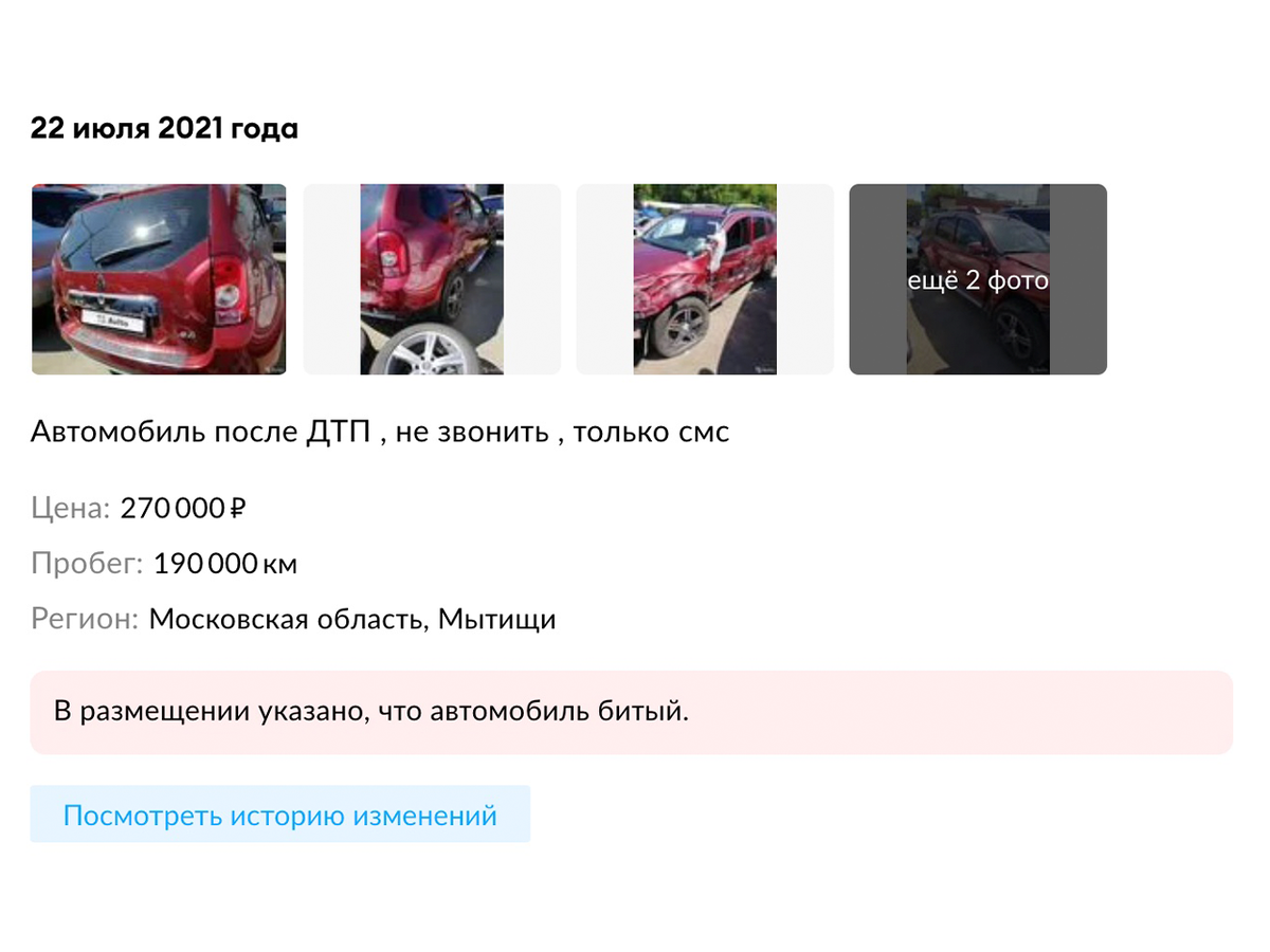 Начнем историю с 22 июля 2021 года, именно тогда Duster был выставлен на продажу в состоянии после ДТП (первые фото), с пробегом 190 000 км. и стоимостью 270 000 рублей. 1 августа была прекращена регистрация, что означает, что автомобиль был успешно продан вторым владельцем. Следующее объявление, с довольно интересной историей, было опубликовано 16 августа. В данном объявлении указано, что Renault битый (отметка), однако в описании сказано, что авто на ходу, крыша и стойки не пострадали, полный пакет документов, ключей и что автомобиль имеет оригинальный пробег - 114 000 км. Стоимость 425 000 рублей. Спустя месяц все фотографии и описание битого Renault удаляются, стоимость возрастает до 755 000 рублей, состояние изменяется с "Битый" на "Не битый", меняется описание, в котором теперь говорится, что автомобиль без ДТП и добавляется всего лишь одна увеличенная фотография задней части автомобиля. Четвертое объявление появилось в начале октября, в описании сказано, что автомобиль в ухоженн