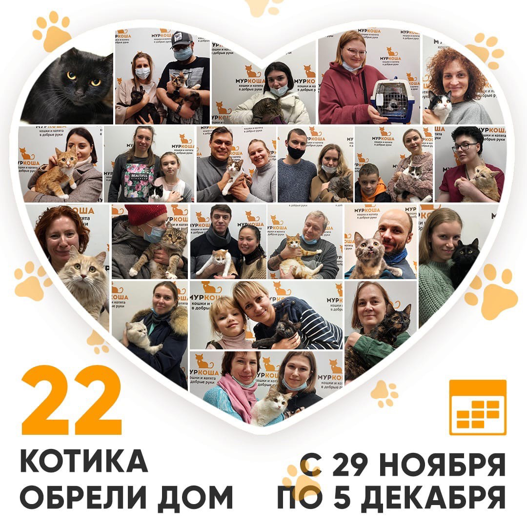 Друзья, по средам мы, как обычно, подводим итоги за прошедшую неделю! Кто же стал счастливым выпускником Adoption центра «Муркоша» с 29 ноября по 5 декабря? 😺 🥳 Итак, за прошедшую неделю домашними и любимыми стали 22 котика! 😽🐈🏡 1. Котёнок-мальчик Кебабчик, 5 месяцев 2. Котёнок-мальчик Фитиль, 5 месяцев Первый осторожный привет из дома: «все хорошо, пока боится, постоянно мурчит, покушал, попил, пописал. Спит с ребенком на теплых полах в ванной». 🥰 3. Кот Спонжик, 7 лет Первый привет из дома: «Спонжик осваивает новый дом 😻 сразу, как только приехал, стал деловито осматривать всю территорию, потом полежал, отдохнул, потом стал везде носиться, надеюсь, от радости 😄». 4. Котёнок-девочка Ракушечка, 2 месяца Первый привет из дома: «Да, и теперь она Белка. Переименовали в соответствии с ее темпераментом. Когтеточку она тоже опознала и попользовала. Огромное спасибо специалистам приюта за качественную работу». 🥰😻 5. Кошка Коташьян, 1 год (кошечка поехала в один дом к нашей выпускн