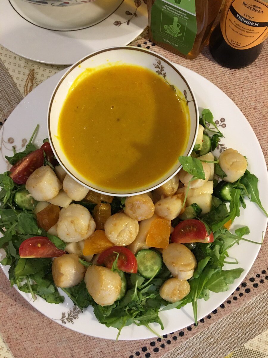 Заправка в салат: Оливковое и кунжутное масло, башкирский домашний мед, соус терияки, сок абхазского лимона, дижонскя горчица в зернах, соль, молотый перец. Что еще? Яркий солнечный суп: Тыква, морковь, лук, имбирь, перец чили нарезать кубиками и пассеровать в топленом сливочном масле с куркумой. Долить кипятка, засыпать красную турецкую чечевицу, кореандр зернами, кардамон, сварить и взбить в блендере в пюре. При подаче супа – на дно тарелки поллимона выжать, по вкусу – соль, соевый соус или кокосовое молоко, травы по желанию. Разморозка гребешков: Гребешки надо размораживать в холодильнике при небольшом плюсе — скажем, при +1 градусе. Если мне нужен гребешок с утра, я ставлю его в холодильник с вечера, при этом обеспечиваю дренаж, чтобы стекала вода. Дома можно положить гребешок в сито и поставить сито в миску. Если в пакете все гребешки слиплись в брикет, значит явно продукт по пути успел растаять, его снова заморозили и продали вам. В пакете с гребешками каждый должен быть в свое