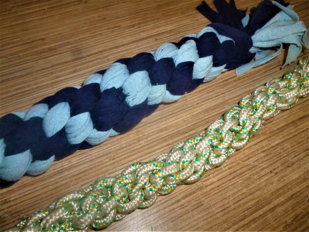 Сплела для своих собак игрушки из веревки и из ненужных футболок. Потребуется не больше часа, а псинки в восторге. Очень просто.