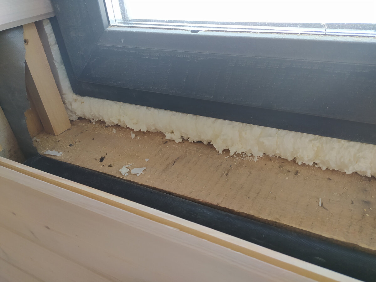 Здравствуйте! Вот и подошло дело к отделке откосов окон и дверей. Заказчик долго не мог решиться, толи сделать откосы из пластика, то ли заказать у столяров готовые, с обналичкой с подоконниками. Но наконец то решил. Откосы из вагонки. Из коротких остатков. Хорошо хоть подоконники заказал заводские, под цвет окон. С подоконниками ничего сложного, разметил, вырезал лобзиком то что нужно, хорошенько запенил. Установщики окон, кстати молодцы, хоть и стоят рамы без специальных защелок для подоконников, зато расстояние везде столько сколько нужно. Подоконник стоит. С откосами конечно пришлось повозиться. Сделать подсистему, напилить вагонку. Все подкрасить, подогнать. Еще и подпиливать пришлось стеновую вагонку, оставлял под пластиковые откосы, а они гораздо тоньше вагонки. Так что пришлось срезать, что бы вагонка не мешала шарнирам. Здесь не стал мудрить, брусок обрешетки прикрутил внаглую с лица, саму вагонку откосов крепил сверху вниз, на гвоздики нейлера. Крепить как на сте