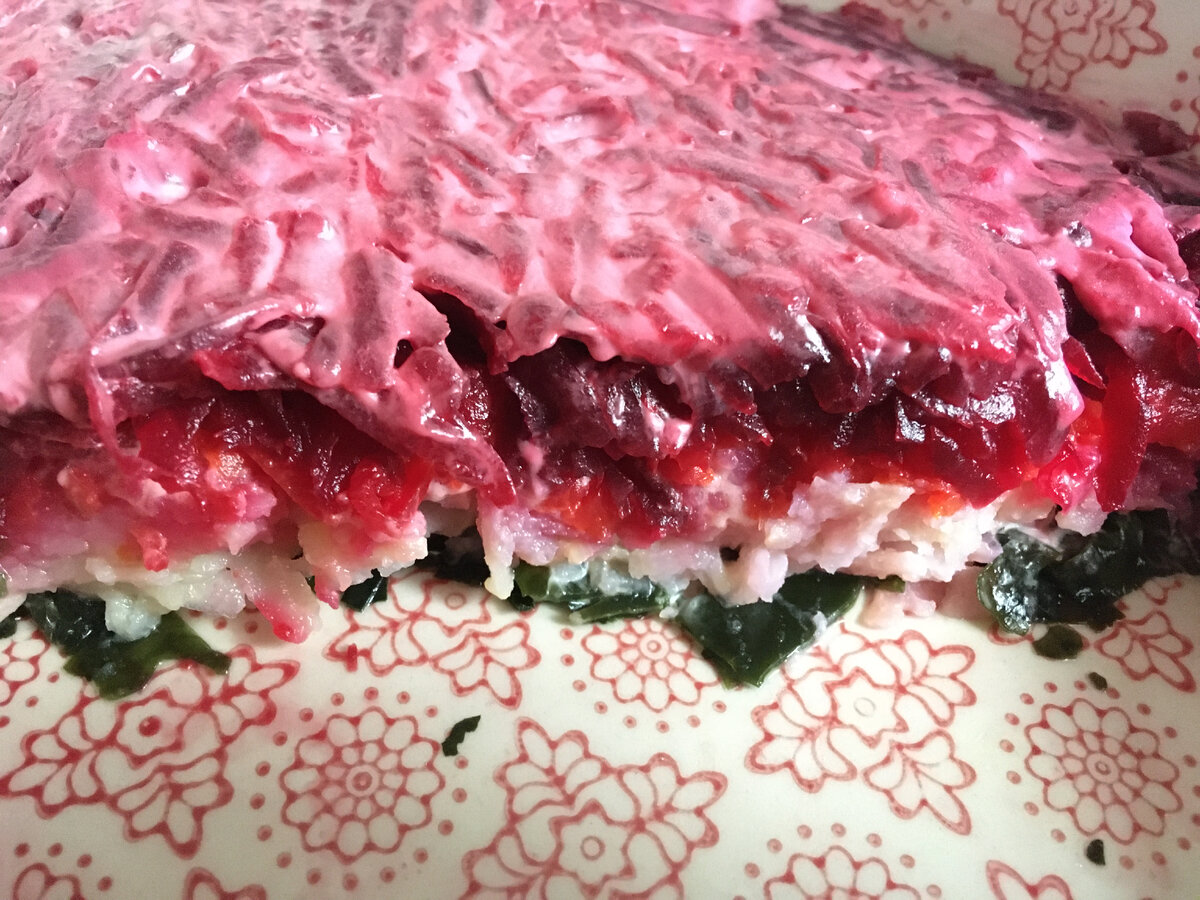Через месяц Новый Год – и мы уже тестируем блюда для праздничного стола. НЕ-СЕЛЁДКА под шубой – веганский вариант популярного салата и наше излюбленное угощение. Мы его обожаем! За два года готовили его по-разному и продолжаем экспериментировать. Вместо селёдки использовали: Почему всё время с нори? Эти водоросли дают рыбный привкус, особенно если добавить к ним льняное масла. А недавно мы попробовали другой вид водорослей – вакамэ. И влюбились! Они очень крутые! Во-первых, вкусные. Во-вторых, у них такая приятная жевательная текстура. И они совсем недорогие: 100-граммовая пачка стоит всего-то 225 рублей, нам её хватает больше, чем на месяц, потому что сухие водоросли сильно разбухают в воде. Они ещё и полезные – в общем, рекомендую! А теперь, давайте готовить! Итак, варим овощи: 2 больших картофелины, 2 свеклы и 1 большую морковь. Дольше всех варится свекла – около двух часов. Водоросли вакамэ заливаем водой. Как разбухнут – ошпариваем кипятком и погружаем в холодную воду. Первый сло