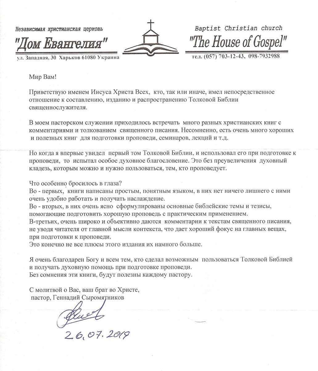 Мир Вам! Приветствую именем Иисуса Христа всех, кто, так или иначе, имел непосредственное отношение к составлению, изданию и распространению Толковой Библии Священнослужителя. В моем пасторском служении приходилось встречать много разных христианских книг с комментариями и толкованием Священного Писания. Несомненно, есть очень много хороших и полезных книг для подготовки проповеди, семинаров, лекций и т.д. Но когда я впервые увидел первый том Толковой Библии, и использовал его при подготовке к проповеди, то испытал особое духовное благословение. Это без преувеличения духовный кладезь, которым можно и нужно пользоваться, тем, кто проповедует. Что особенно бросилось в глаза? Во–первых, книги написаны простым, понятным языком, в них нет ничего лишнего с ними очень удобно работать и получать наслаждение. Во–вторых, в них очень ясно сформулированы основные библейские темы и тезисы, помогающие подготовить хорошую проповедь с практическим применением. В-третьих, очень широко и объективно дают