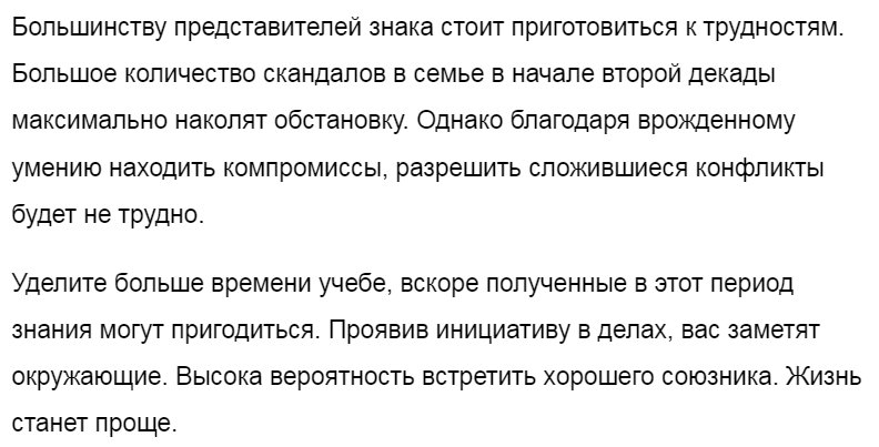В первую декаду зимы пространство большинства представителей знака будет наполнено потрясающими идеями и поражающими воображение планами. Главное суметь раскрыть свой внутренний потенциал, чтобы к воплощению целей не прикладывать никаких усилий. Вас будет нести на автопилоте, главное доверяйте своему внутреннему чутью. Не сворачивайте даже если моментами, на вашем пути повстречается эмоциональное опустошение. Всё обманчиво. Львы, обратите внимание: Внизу вы можете узнать что вас ожидает, с помощью карт-таро Узнать будущее