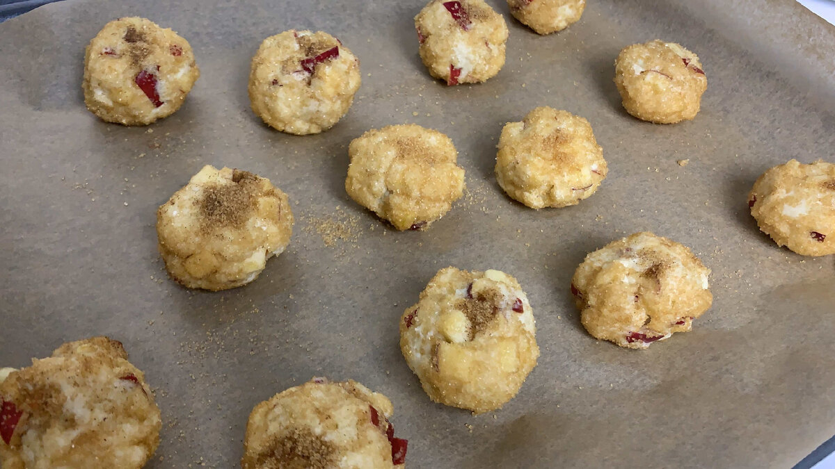 Здравствуйте, дорогие друзья! На днях ходили в гости на день рождения моего любимого племянника. Сестра мужа накрыла шикарный стол. Больше всего меня зацепил вот этот рецепт. Я его в подробностях узнала и решила тоже дома приготовить. Смешала в блендере нежирный творог, сливочное масло, сахар и щепотку соли. Чтобы масло лучше взбивалось, разрезала его на небольшие кусочки. Дальше добавила муку и разрыхлитель, всё перемешала. Затем взяла 3 небольших яблочка, порезала их на мелкие кубики. Думала сначала почистить кожуру, но решила всё-таки оставить как есть. Дальше тесто переложила в миску и насыпала туда порезанные яблоки. Смешала всё руками. Затем сделала посыпку. В отдельную небольшую ёмкость насыпала тростниковый сахар и добавила корицу. Из теста с яблоками скатывала небольшие шарики и обмакивала их к сахар с корицей. Выложила всё на пергамент на противень. Осталось только запечь! Поставила в духовку на 35 минут при 180 градусов. Спустя полчаса все печенья готовы! Получилось невероя