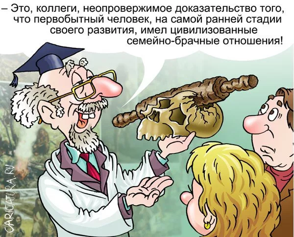 Карикатурист о котором сейчас пойдёт речь, с детства знал, что станет художником. Андрей Саенко со школьной скамьи рисовал на одноклассников и учителей шаржи. А также на соседей и знакомых. Подмечал самые яркие черты внешности и характера, создавая узнаваемые типажи. Превращая недостатки, пороки, чудачества в форму анекдота. Чтобы никому не было обидно, а всем было весело. Даже узнавая кого-то из своих близких на карикатуре. Вот, как здесь например. Профессор стал героем сразу двух иллюстраций. И вовсе не факт, что это один и тот же человек, ведь в первом случае он - антрополог, а во втором - математик. Просто "профессор" - это типаж. Худой, высокий, с залысиной и торчащими вихрами. Сегодня вас ждут 20 карикатур обо всём на свете авторства Андрея Саенко. Приятного чтения и натсроения) Кроме того, творческий человек увлекался мозаикой, чеканкой и лепкой. Закончил художественный институт, как реставратор. Стал брать заказы, сначала у знакомых, затем в рассылать в журналы свои работы. Со
