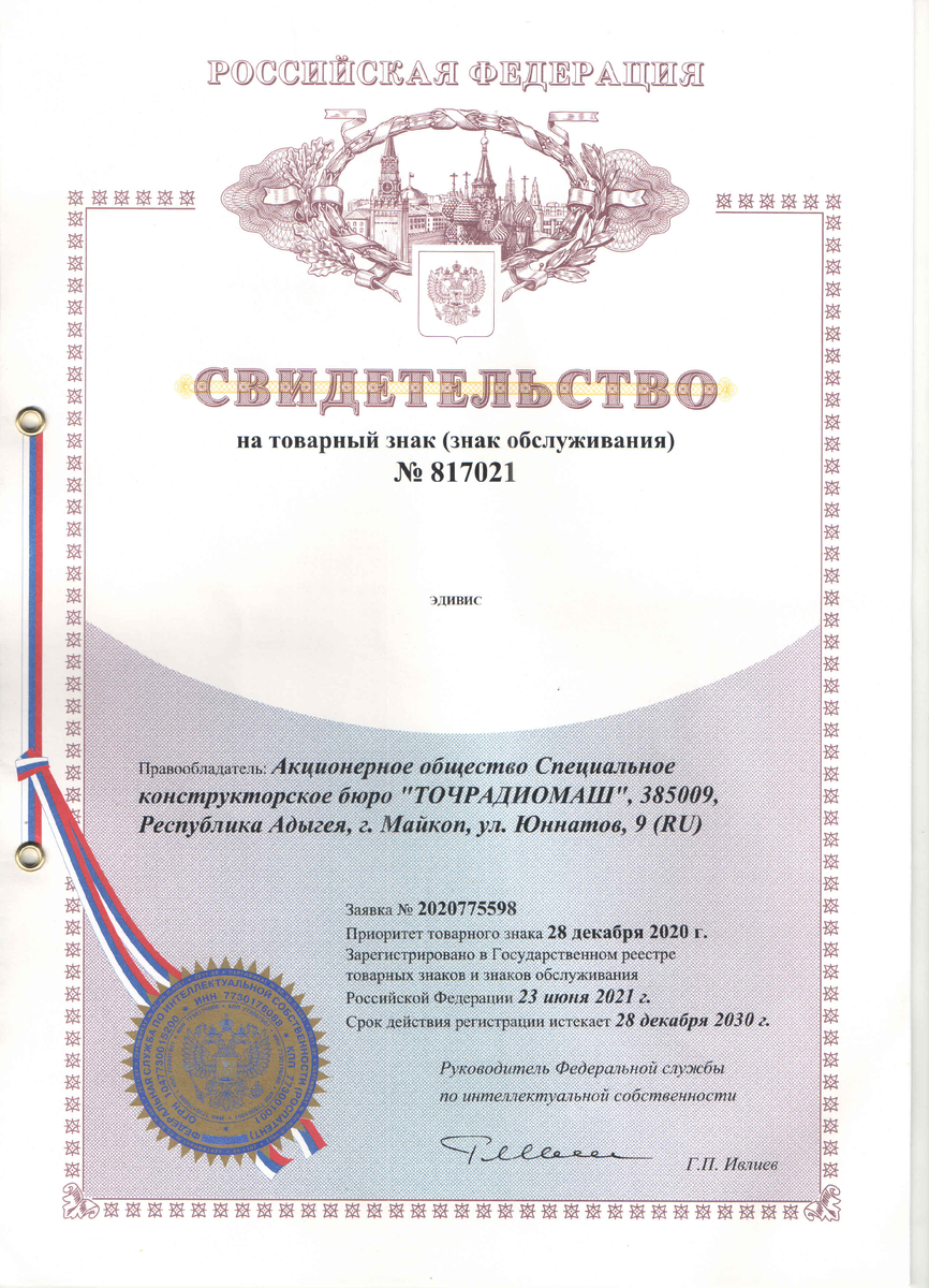 АО СКБ "Точрадиомаш" зарегистрировала новый товарный знак для своих виброиспытательных систем. Согласно внутреннего приказа организации от 11.11.2021г. №53, старый товарный знак для электродинамических виброиспытательных систем (УВЭП) заменен на "ЭДИВИС" в соответствии со свидетельством на знак обслуживания №817021. Применение старого товарного знака (УВЭП) разрешается в рамках договоров заключенных до издания внутреннего приказа от 11.11.2021 на использование нового товарного знака (ЭДИВИС). Свидетельство о регистрации товарного знака