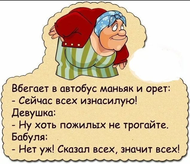 — Да нет, ребятки, мой старик уж так шаркает — на неделю бы хватило… Анекдот 4: В электричке две старушки затеяли бесконечный спор, открывать окно или нет. Одна настаивала на том, что окно должно быть открыто, или она задохнется.