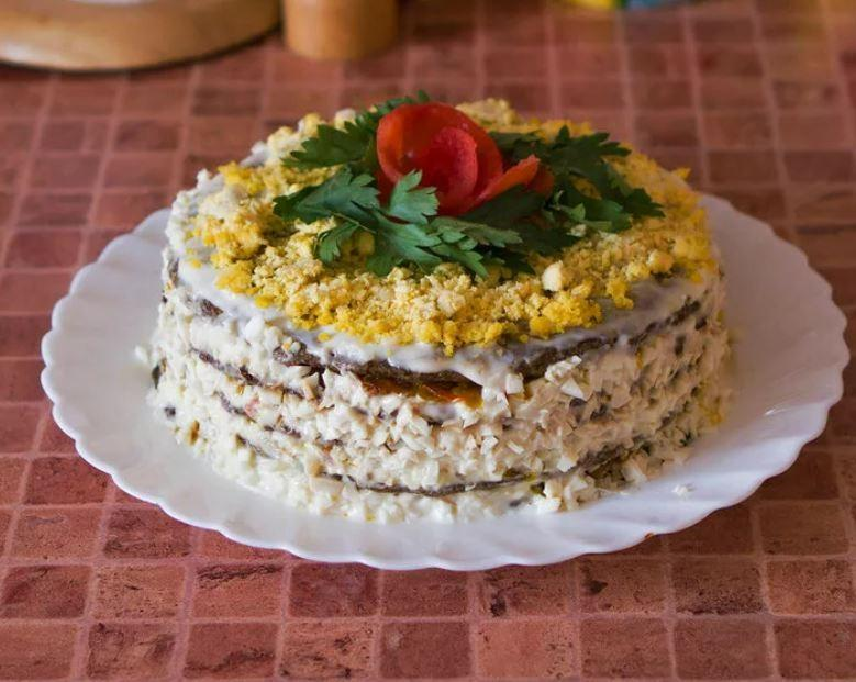 Многие готовят такие тортики на праздничный стол. Получается всегда красиво, богато, вкусно и очень сытно. Особенно их ценят мужчины под крепкие напитки. Наш торт необычный, в нем спрятались несколько начинок и вкусный соус. Ингредиенты: Для начинки: Для соуса: Как готовить: 1. Печень пропустить через мясорубку. Добавить яйца, 2 ст. л. растительного масла, майонез и соль. Затем всыпать муку. Замесить довольно жидкое тесто, как на блины, но чуть гуще. 2. Смазать сковороду растительным маслом и прокалить. Печь печеночные коржи с двух сторон, смазывая сковороду после каждого второго. Можно выпекать и на сухой. 3. Приготовить соус бешамель. Для этого растопить в сотейнике сливочное масло, влить растительное. Обжарить в масле муку и тонкой струйкой влить молоко. Постоянно помешивать соус пока он не начнет густеть и не исчезнут все комочки. Посолить, поперчить. Приправить по вкусу молотым порошком чеснока и зеленью. Уварить до нужной густоты. 4. Начинки у нас разные - это и есть изюминка рец