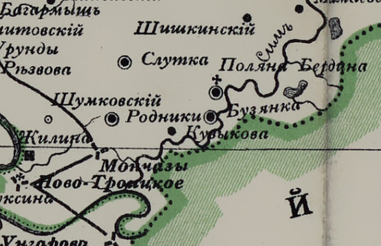 Здесь мы возьмем участок в междуречье рек Белая и Сим. "Починок Бузанка - по горе со скатом к р. Симу. Изменения в угодьях: около 139 дес. леса распахано. Землею владеют пропорционально внесенной каждым членом товарищества сумме денег. Поля по склону на восток. Почва - суглинок. В полях до 10-ти оврагов, берега которых ежегодно обваливаются и размываются. Огородов нет. Промыслы: работают на пристанях". ( С. 695) " Родники - по равнине; р. Родник, пригодная для мельниц, но лишь для небольших. Селение в центре надела. Изменения в угодьях: расчищено около 150 дес. леса. Поля по холмистому месту со скатами в разные стороны. Почва суглинистая. В полях 6 оврагов с обнаженными берегами, вследствие чего они ежегодно увеличивается от весенних вод. Заросли в двух участках. Промыслы: работы на пристанях; до 30 р. в год на человека". "Резанова-Слутка - по скату на восток; река Манчаза, непригодная для мельниц. Земля в пяти участках. Изменения в угодьях: около 277 дес. леса расчищено. Форма владе