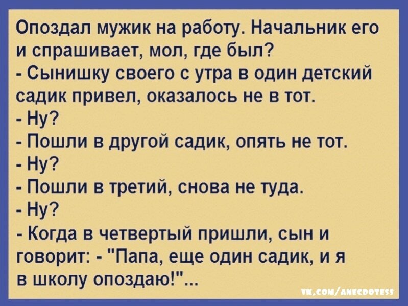 Свекровь говорит невестке: - Живем мы хорошо, не ругаемся, все у нас есть, вот только хата не побелена! - Мама, а краска есть? - Краска есть, да щетки нету! Невестка бежит к свекру, обрезает ему бороду, делает щетку и белит хату. Свекровь: - Вот хата у нас теперь побелена, а окна не покрашены! - Мама, а краска есть? - Да есть, но кисточки нету! Невестка бежит к свекру, обрезает ему усы, делает кисточку и красит окна. Возвращается с работы муж, видит на дереве своего отца и спрашивает: - Папа, что с тобой, почему ты на дереве сидишь? - Сынок, да бабы собрались блины печь, а я не знаю, есть ли у них яйца! Бабка говорит врачу: - Доктор, у меня проблема, я везде и постоянно пукаю. Можно сказать, что это вовсе не проблема, потому что беззвучно и без запаха, вот и сейчас я пукаю, и ничего! - Попринимайте вот эти таблетки и через недельку приходите снова. Через неделю: - Доктор, какие таблетки вы мне дали, стало ужасно пахнуть? - Прекрасно, обоняние восстанавливается, теперь займёмся вашим с