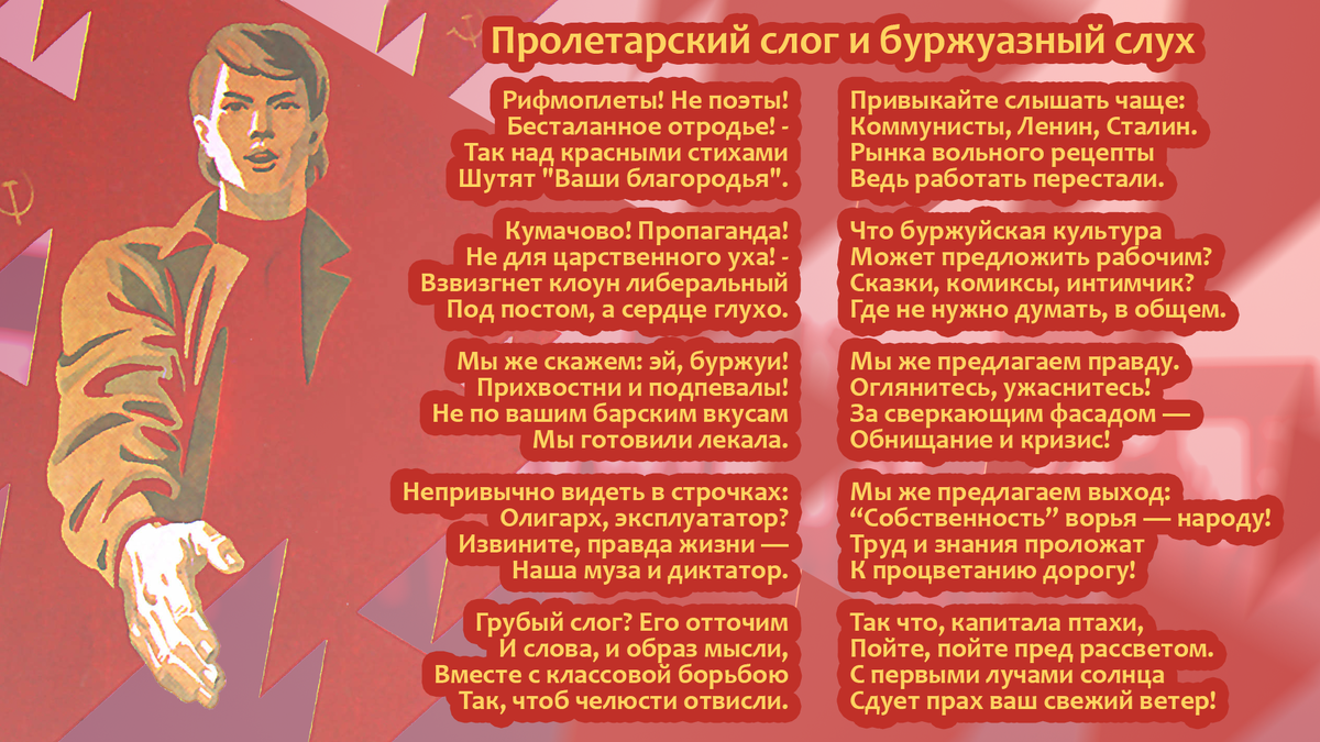 Снова на страницах нашего журнала рубрика "Социальные стихи" (Соцстихи), в которой мы не только призываем подписчиков читать наши работы, но и конструктивно обсуждать их недостатки, чтобы, как говориться, двигаться дальше, прогрессировать! Но, к сожалению, на просторах сети встречаем в основном огульную критику от разномастных буржуазных оппонентов. Им мы и посвящаем наше следующее стихотворение "Пролетарский слог и буржуазный слух". Просим любить, жаловать и критиковать! «Пролетарский слог и буржуазный слух»
