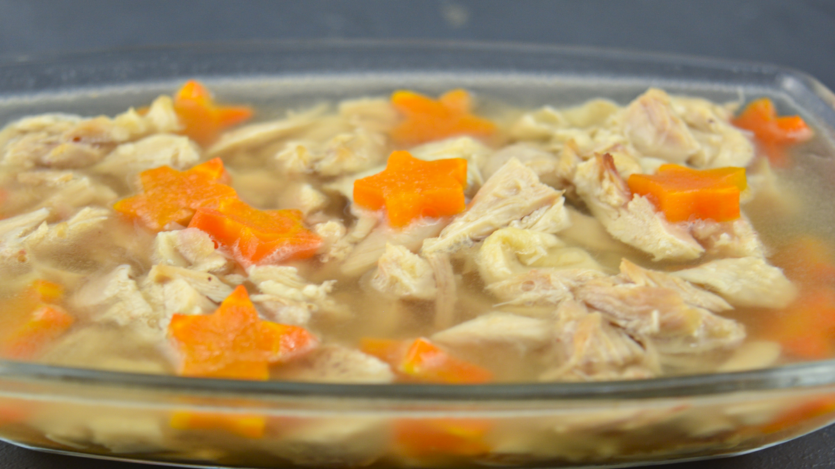 Аппетитный и вкусный холодец для праздничного стола. А приготовить его можно не только с жирным мясом, но и курицей. Процесс – простой и недолгий. В этом рецепте я предлагаю использовать желатин. Благодаря этому, для закуски не нужно много мяса, застывает блюдо быстрее, да и времени на его приготовления много не уйдет. Застывает закуска очень быстро – у меня на это ушло 2 часа. Мне даже больше нравится холодец именно с курицей – бульон и мясо получаются вкуснее. А еще холодец не сильно жирный. Сначала нужно отварить куриные голяшки в воде. Довести до кипения на умеренном огне и слить воду. Залить мясо водой снова и положить в кастрюльку морковь. Довести бульон до кипения, убирая пену. Посолить и поперчить. Также рекомендую добавить лавровый лист – буквально несколько штук. Готовить холодец стоит продолжать на медленном огне на протяжении 15-ти минут. Затем курицу и морковь можно переложить на чистую тарелку и процедить бульон через сито. 50 мл теплого бульона перемешать с быстрора